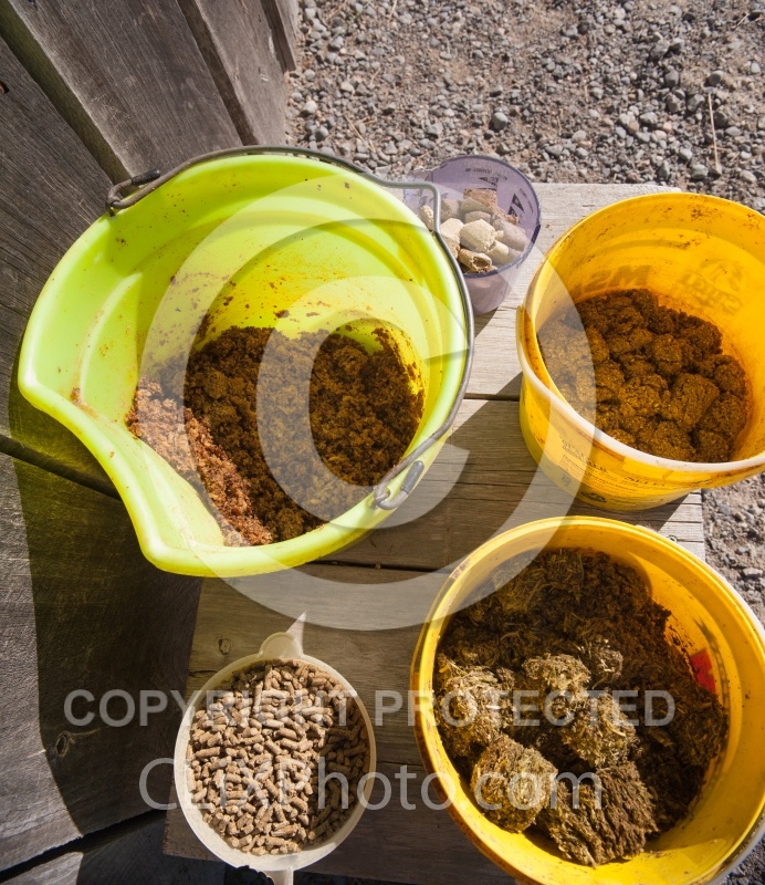 Photo Title: Senior Horse Feed - Soaked Beat Pulp, Soaked Hay Cubes, Soaked Masterfeed Senior Crunch, Dry Masterfeed Senior Crunch and Merit Senior Pellets