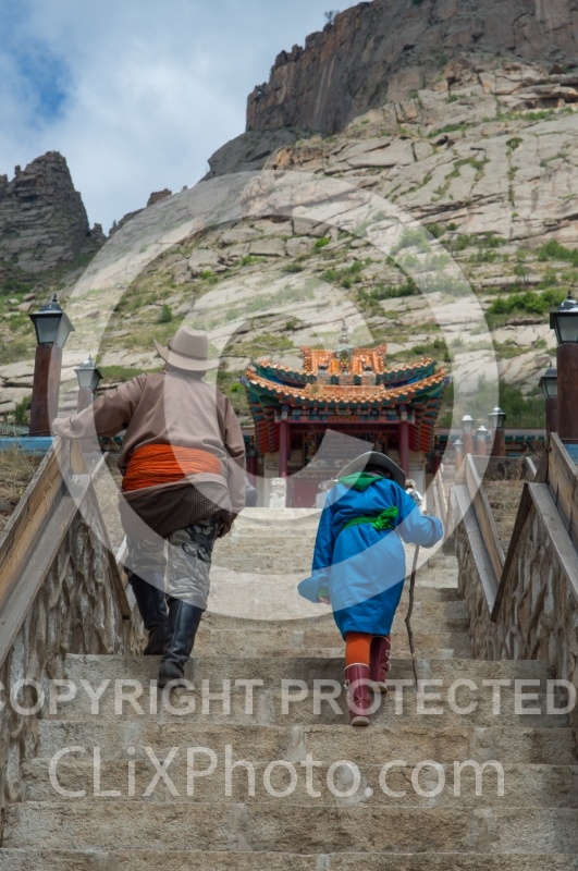 Photo Title: Baagii and Bugiin climb the Stairs to the Monastery