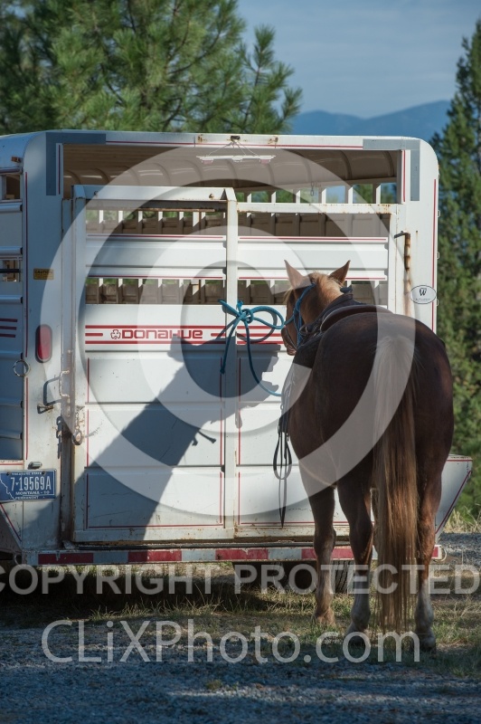 Bar W Ranch Horse Tied to Trailer