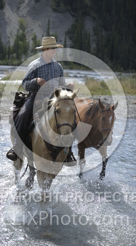 wild deuce womens retreat, riding vacations, trail riding, water crossing, river crossing, ponying, leading horse through water, young trail horse, western