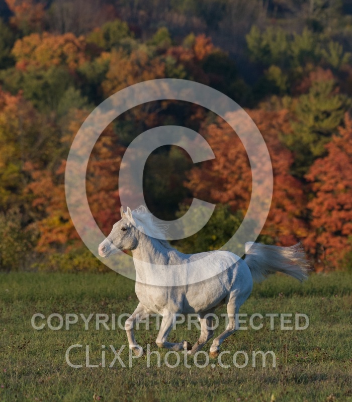 Description: Grey Morab Free Running in Fall |