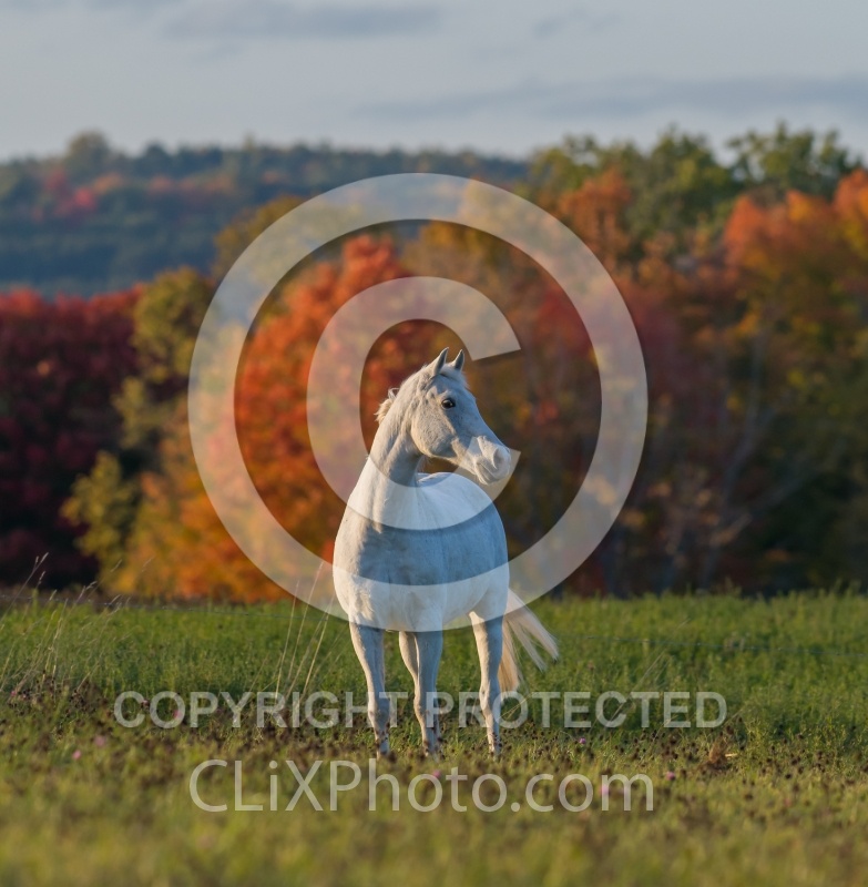 Description: Grey Morab Free Running in Fall |