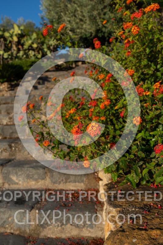 Flowers border the Stairway from the pool