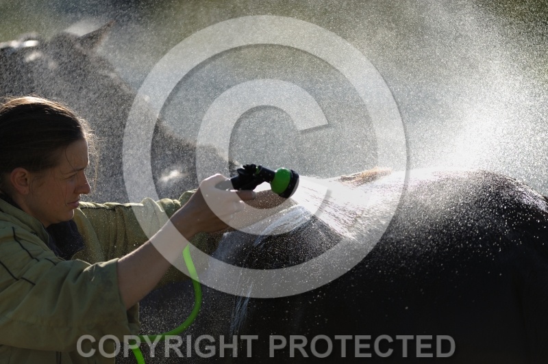 bathing, hosing, hosing off, rinsing, cooling off, cooling down