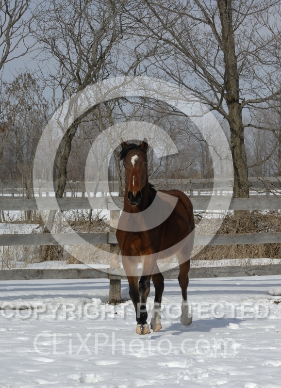 Leo, Two year old Welsh Thoroughbred Cross running in the snow. Owned by Fallowfield Farms