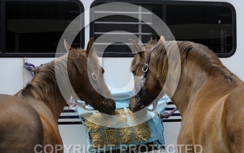 Eating hay by Trailer, Storm & Mounty Eating hat at trailer